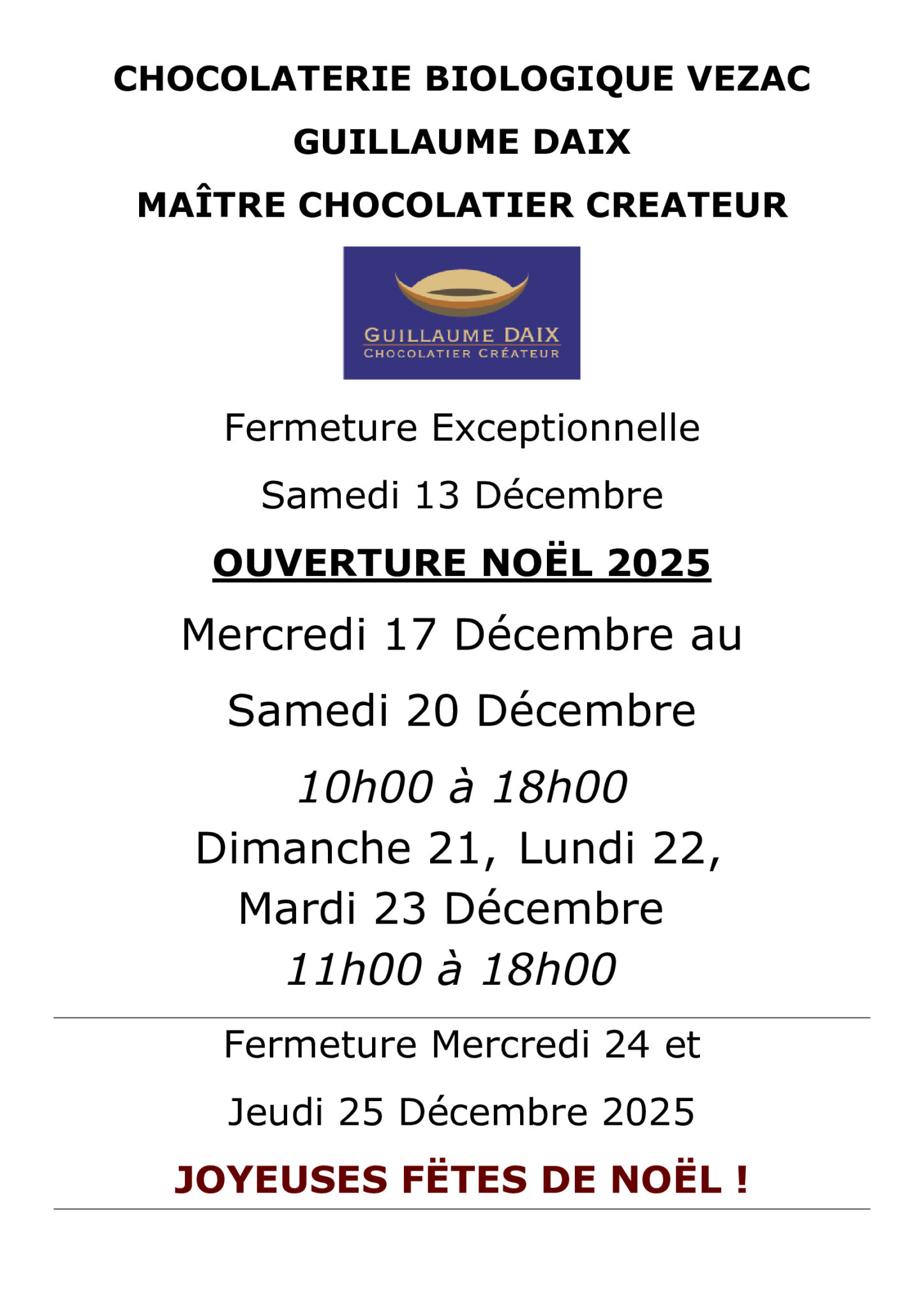 Pour votre bienvenue à la Chocolaterie Bio à Vézac, voici nos horaires d’ouverture